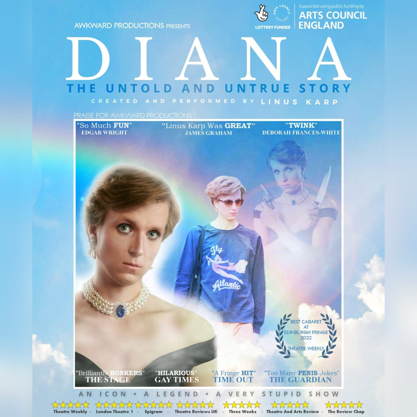 As expected, Diana: The Untold and Untrue story is royally ridiculous, filled with an abundance of notable references sprinkled in to the humorous performances – from the miles long wedding dress train, to the unexpected Come Dine With Me ‘What a sad little life’ quote worked into an interaction between Diana and Camilla. This show is another gem from the iconic Awkward Productions duo.